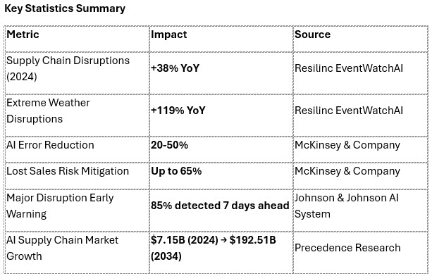 - McKinsey & Company – For AI reducing supply chain errors by 20-50% and mitigating lost sales risk by up to 65%.