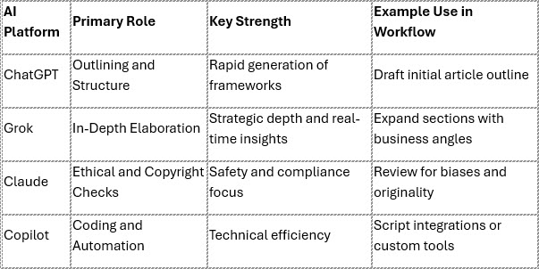 For example, if the outline touches on “the value of leveraging different AIs,” Grok can elaborate with strategic examples, such as how businesses use AI for competitive advantage in market analysis or innovation pipelines. Its strength lies in adding depth, think layered arguments, data-backed reasoning, and forward-thinking perspectives. In a business context, Grok might suggest integrating AI for scalability, drawing from trends in tech entrepreneurship.
